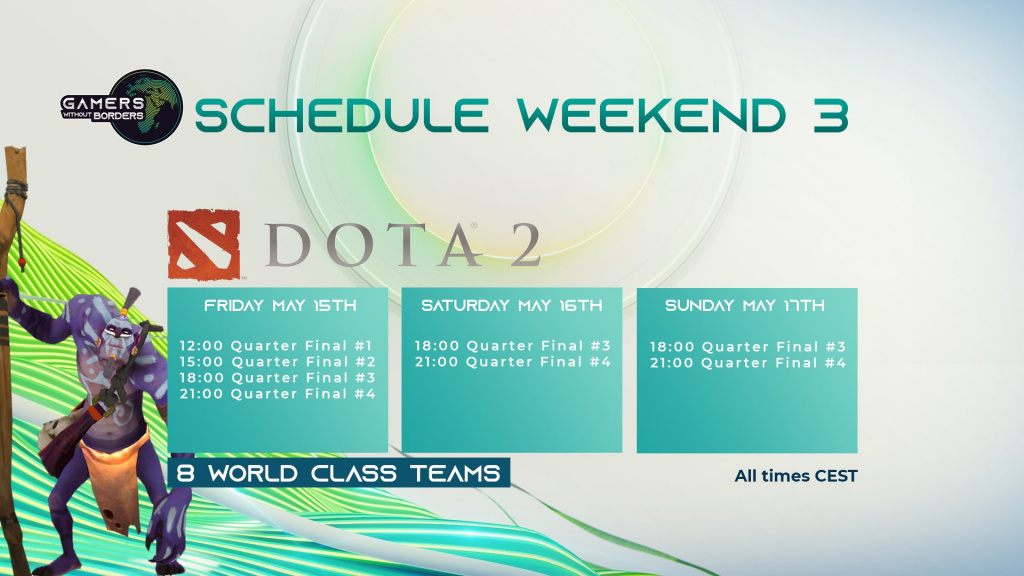 Le tournoi de charité Dota 2 Gamers sans frontières se déroulera du 15 au 17 mai 2020. Chaque journée commence à 11h00 GMT + 1.