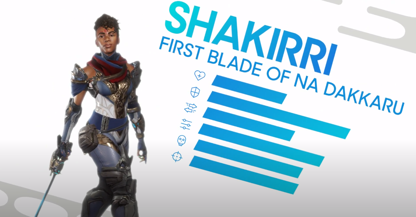 Shakirri est un maître de la précision qui bat ses ennemis avec style. Elle brandit une épée et un pistolet, permettant aux joueurs de basculer entre ce qu’ils préfèrent pour différentes situations. Elle peut également déployer des boucliers défensifs pour repousser les ennemis.
