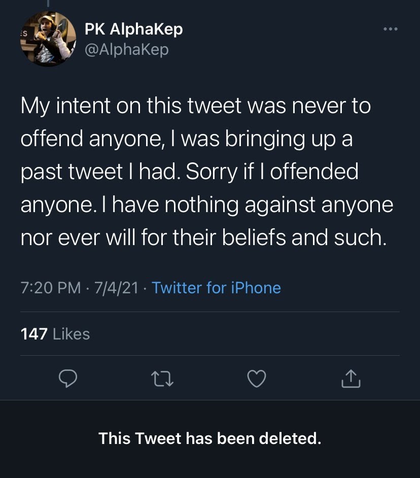 Alpha a tweeté des excuses dans l’heure qui indiquait que son « intention n’était d’offenser personne » et qu’il n’avait « rien contre personne ni ne voudra pour ses croyances et autres ».