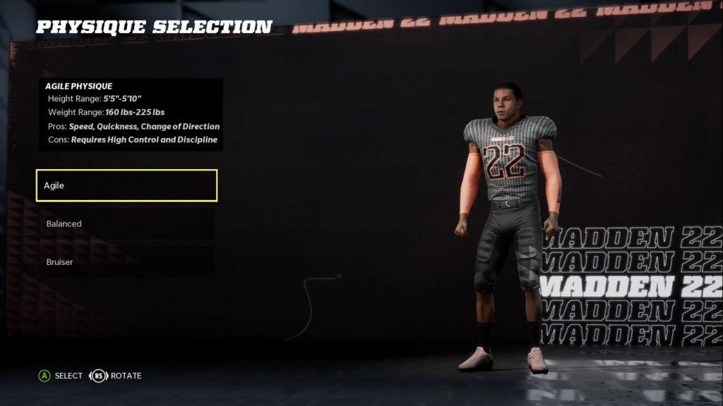 Une fois que vous avez commencé votre chemin dans Madden 22 et commencé à créer votre avatar, le jeu vous présentera un menu pour sélectionner le type de physique de votre préférence qui pourrait être :