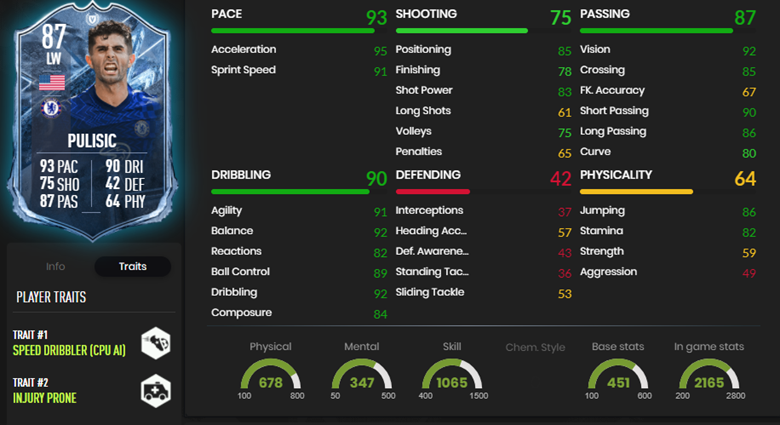 Pulisic est plus The Flash que Captain America dans le couloir de droite. De plus, 82 Stamina garantit que cet Américain pourra jouer au moins 75 minutes à chaque match avant d’être remplacé. Cependant, en raison de statistiques physiques médiocres avec seulement 59 de force, 49 d’agression et 69 kg de poids, vous devez utiliser l’agilité de Pulisic pour éviter les duels physiques directs avec les défenseurs de vos adversaires.