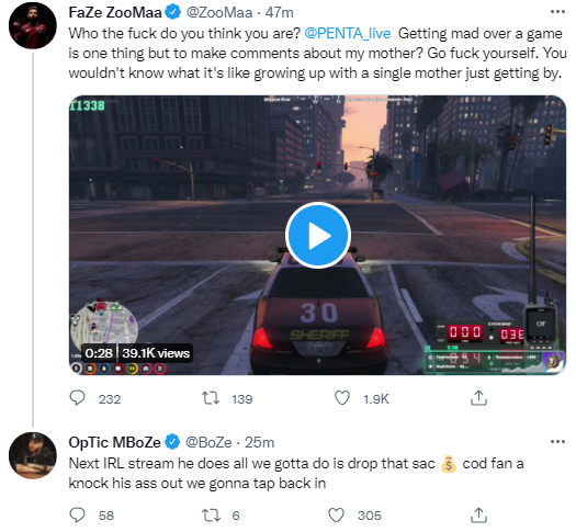Après qu’une altercation impliquant les deux a éclaté sur le serveur NoPixel, Penta a dénoncé le comportement de ZooMaa, citant qu’il est probablement dû au fait qu’il a été élevé par une « mère célibataire merdique ». Alors naturellement, l’ancien pro de COD a riposté, déclenchant un va-et-vient sur Twitter.