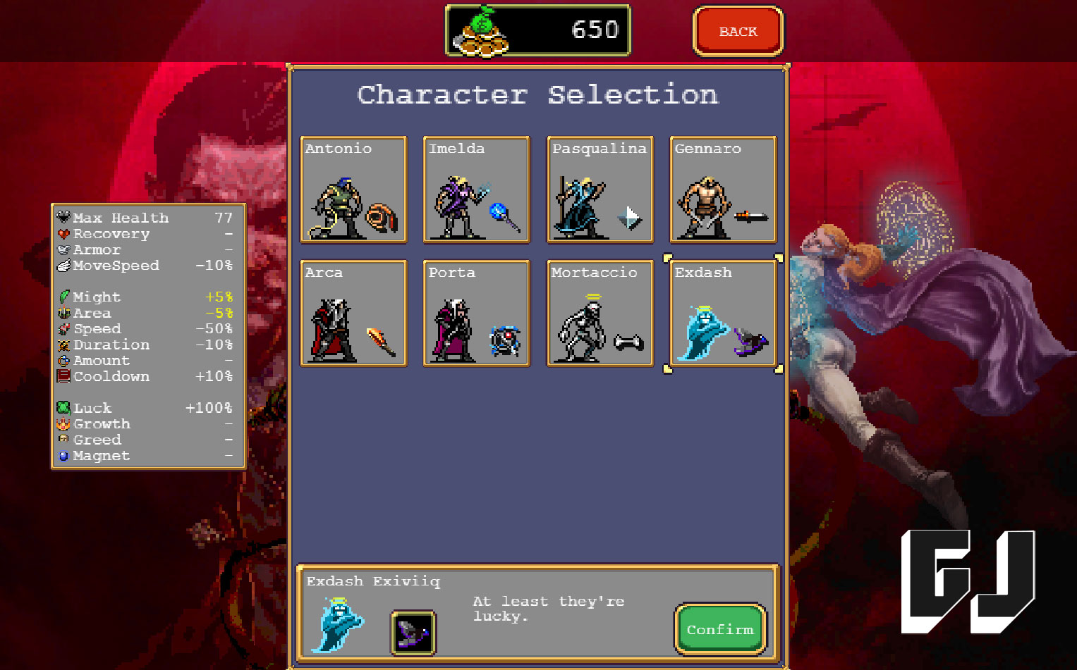 Après avoir jeté un coup d’œil aux statistiques, vous remarquerez peut-être immédiatement qu’Exdash Exiviiq a + 100% de chance. La description du personnage se lit également: « Au moins, ils ont de la chance. » En dehors de cette statistique, la santé maximale fait défaut, et la vitesse et la vitesse de déplacement sont très lentes. Cependant, la statistique de grande chance fait d’Exdash un excellent personnage pour la culture de l’or.