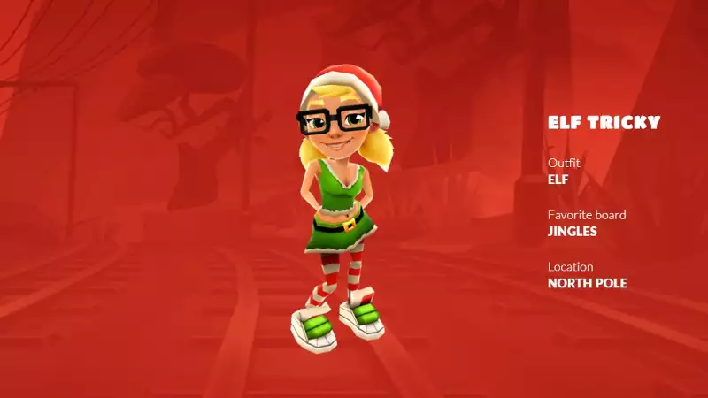 Elf Tricky est une variante sur le thème des elfes de Tricky, le membre principal de l’équipe des Subway Surfers. Elle arbore une tenue d’elfe festive, avec une palette de couleurs verte, rouge et blanche.