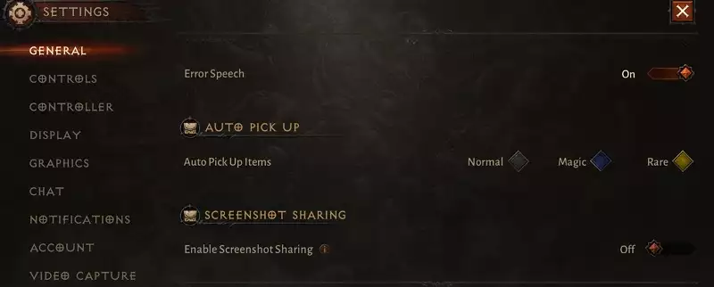 - Dans l’onglet Général, vous rencontrerez la section Auto Pick Up, entre les sections Error Speech et Screenshot Sharing.