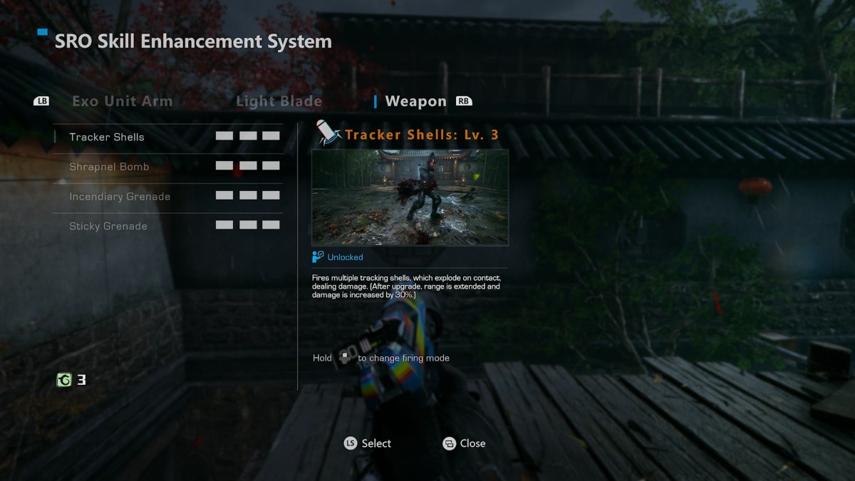 - Chacune de ces sections présente différents aspects de votre personnage qui peuvent être déverrouillés et améliorés. Le bras Exo Unit s’applique aux capacités que Shelia peut utiliser avec des choses à débloquer telles que EMP, Tractor Beam, Shock Punch et Quake Punch, Light Blade s’applique aux combos et aux attaques que son arme de mêlée peut faire, et Weapon est pour la force de que les munitions spéciales que les armes utilisent contre les ennemis.