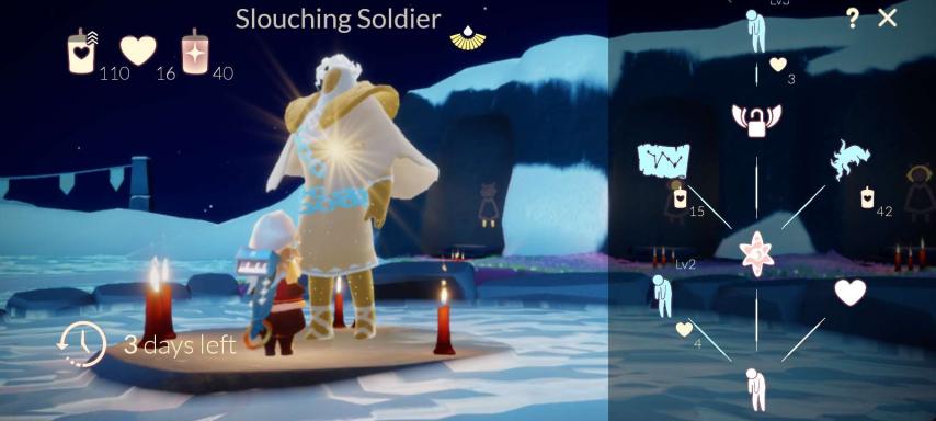 L’esprit voyageur actuel, la Soldat avachipossède plusieurs objets uniques qui pourraient intéresser les joueurs. Le premier d’entre eux est un objet que la plupart des TS portent : un cœur (monnaie du jeu) qui vaut pour 3 bougies. Vous pouvez utiliser ce cœur pour aider à acheter certains des autres produits cosmétiques que cet esprit porte, ainsi que d’autres articles saisonniers.