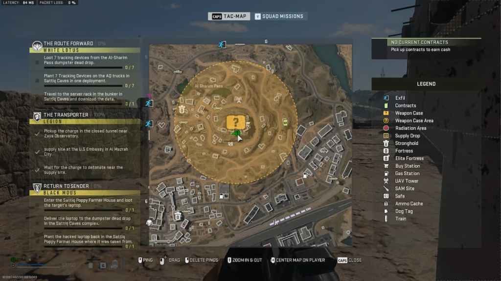 Au cours de la mission de faction Tier 5 White Lotus, « The Route Forward », vous serez chargé de piller certains dispositifs de suivi comme première étape vers l’achèvement. Ces dispositifs de suivi sont situés à Al Mazrah, plus précisément au col d’Al Sharim. Cependant, il est assez difficile de trouver l’emplacement correct de la chute morte, car la zone orange qui signale l’emplacement approximatif est assez grande. Comme vous pouvez le voir dans les objectifs, vous devez trouver une benne à ordures, donc regarder à l’intérieur de chacun d’eux peut prendre un certain temps. Heureusement, la bonne benne à ordures se trouve à peu près au milieu de la zone orange, comme indiqué ci-dessous.