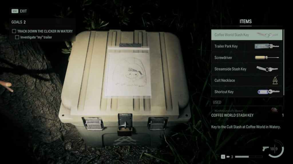 Une fois que vous avez repéré la gigantesque tasse, continuez et contournez-la jusqu’à ce que vous puissiez va derrière. Ici, vous trouverez la clé de cachette de Coffee World et pourrez retourner au coffre. En déverrouillant le coffre, les joueurs gagneront des munitions pour arbalète, pistolet et fusil de chasse. De plus, une note sera à l’intérieur du coffre, un peu comme les autres que vous trouverez. Et légère alerte spoiler, la note explique que deux personnes nommées uniquement « T » et « M » auraient dû patrouiller la nuit précédente, mais ne se sont pas présentées. Peut-être devrions-nous demander aux députés de Bright Falls, Thornton et Mulligan, s’ils savent de qui il s’agit.