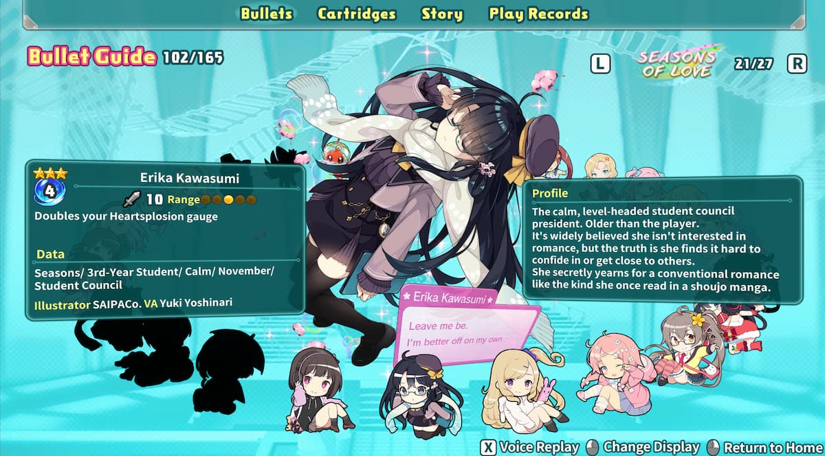 - Erika Kawasumi – Puissance 10, Portée 1, Coût 4, Jauge Heartsplosion double. Caractéristiques des données : Saisons/Élève de 3e année/Calme/Décembre/Conseil des élèves